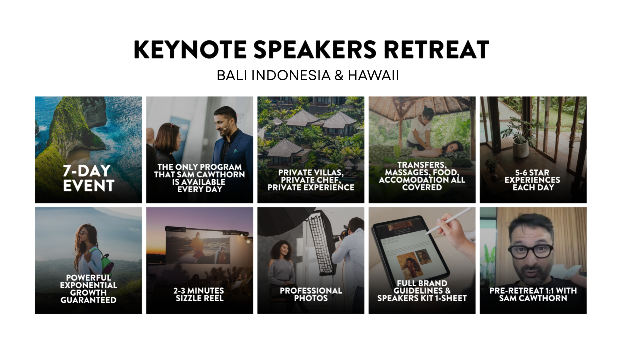 We are thrilled to invite you to two exclusive 7-day immersive retreats, personally led by Sam Cawthorn and his expert team: from JAN 21-28, 2026, in Bali, and from FEB 27 - MAR 6, 2026, in Hawaii