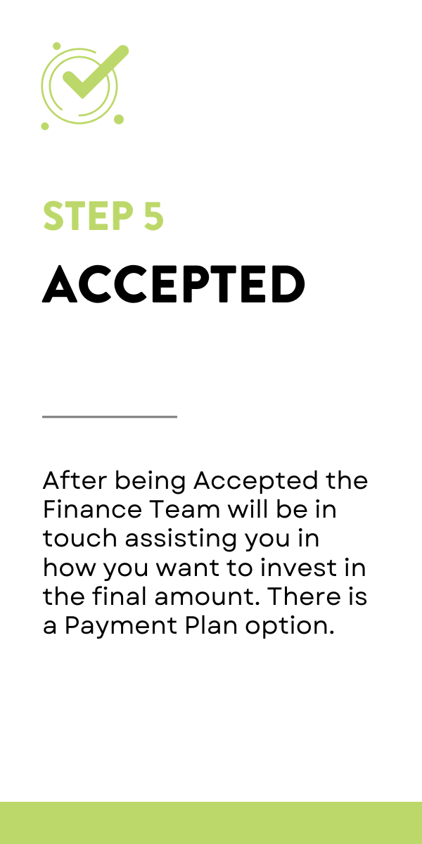 Upon acceptance into the program, if you choose to proceed, you will need to make the necessary investment. We currently have a promotion available, allowing you to choose between a ‘Pay in Full’ option or a flexible Payment Plan.