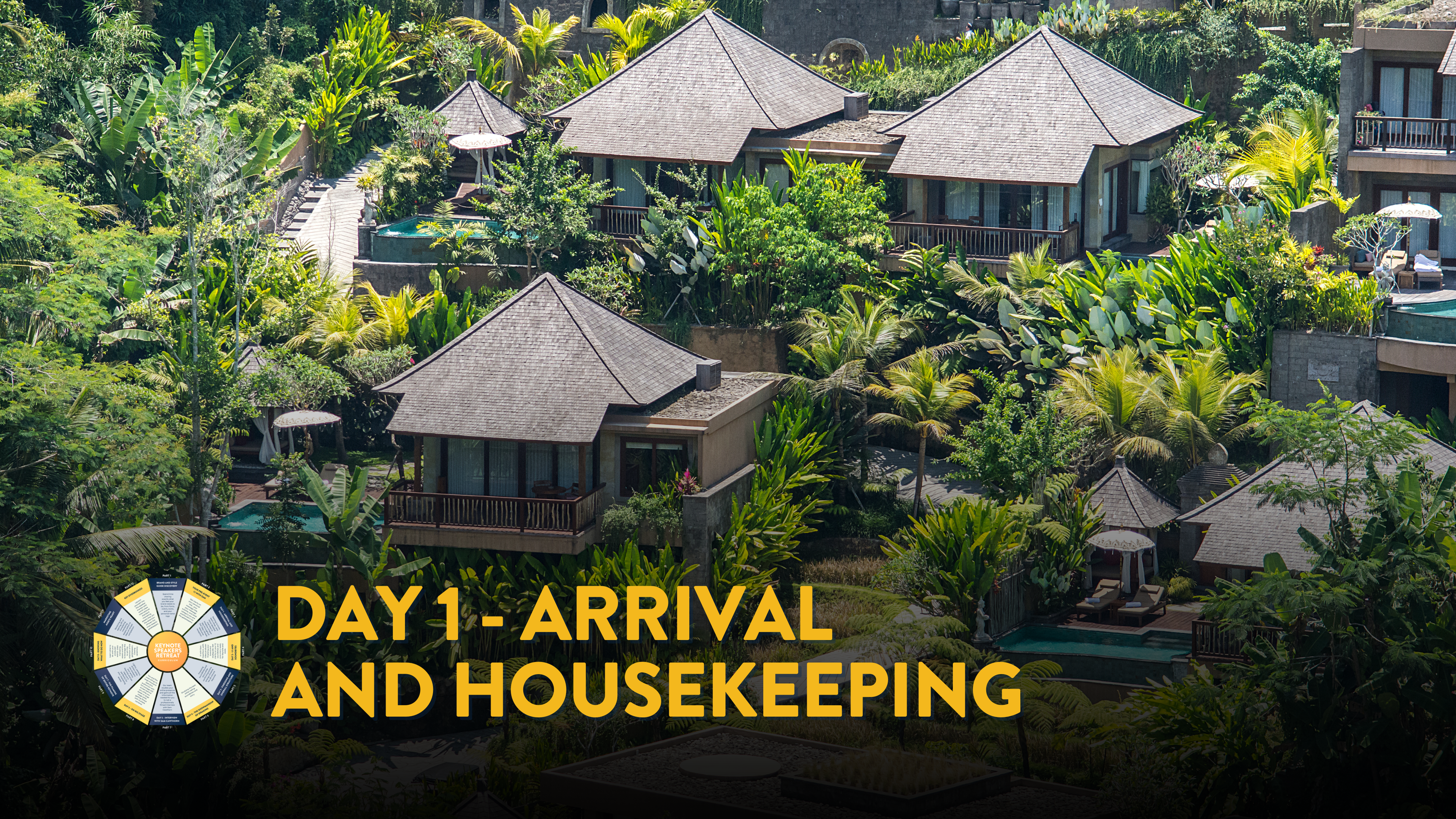 Day 1 - arrival, housekeeping, getting to know each other, and more detailed overview in timeline of each day throughout the 7day retreat. Welcome reception