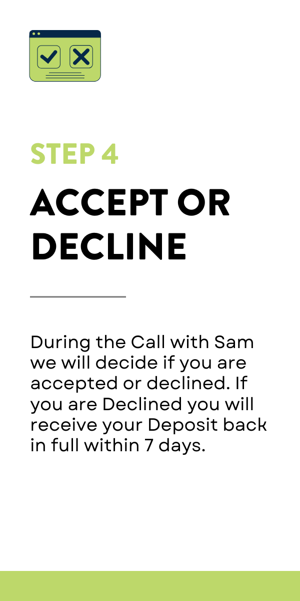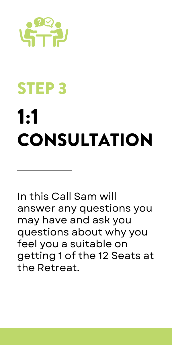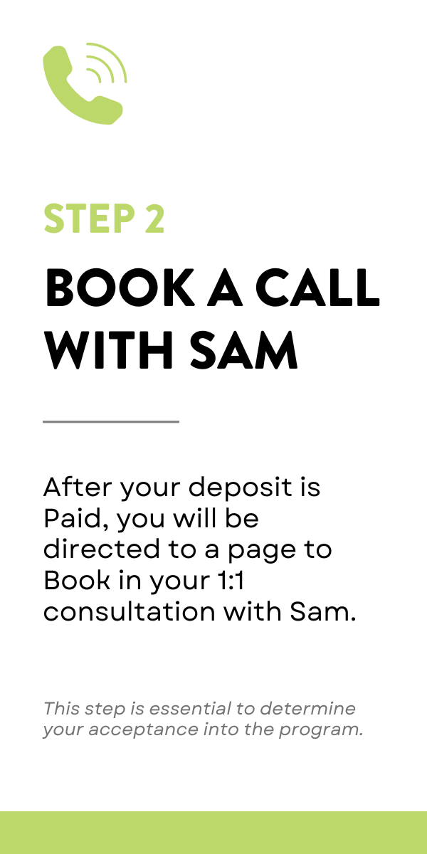 Acceptance: Please note that not all applicants will be accepted into the program. Refund Policy: If your application is unsuccessful following your 1:1 consultation with Sam, the deposit will be fully refunded.